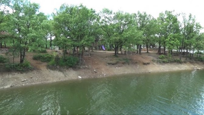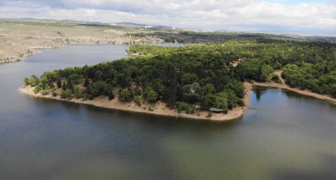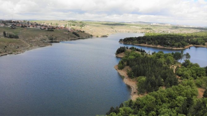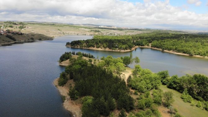 Mavi ile yeşilin buluştuğu Enne Barajı ve Tabiat Parkı, İHA tarafından havadan da görüntülendi.