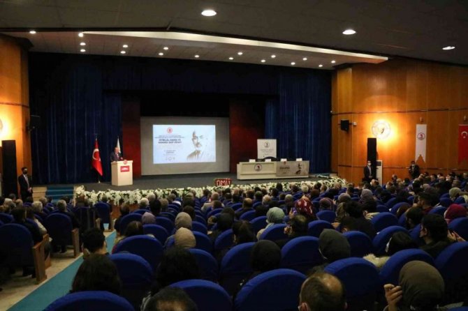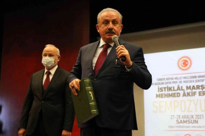 Konferansta İstiklal Marşı'nın önemine değinen Prof. Dr. Mustafa Şentop, "İstiklal Marşı, Mehmet Akif Ersoy'un kahraman ordumuza ithaf ettiği, milletimizin tüm fertlerinin topyekun anı şevk ve heyecanla terennüm ettiği esasen şiir ya da marş hüviyetinin de dışında kalan bir metindir. Bu milletimizin kimlik kartıdır. İstiklal Marşı sihirli bir metin hüviyetine haizdir. İçinden bir kelime ya da hece eksik söyleseniz ahengi bozulur. Bestesi kendi içinde mevcuttur. Söz ile vücudu yükselten güçlü vurgular onu şiirden marş havasına taşır. İstiklal Marşımızdaki büyük ifade gücü Milli Mücadele sırasında insanımızda ortaya çıkan büyük ve gizli enerjinin coşkun halidir. Tıpkı Çanakkale Savaşı'nda 100'lerce kiloluk mermiyi sırtında taşıyan Seyit Onbaşının savaştan sonra yanı mermiyi tekrar kaldırmaya teşebbüs ettiğinde bunu başaramaması gibi. Savaş meydanında imanla azimle devleşen asil insanımızın vurgulama ve söyleme enerjisinin taşma halidir. Kimileri buna iman gücü dese de yok edilmek istenen bu milletin küllerinden doğduğu İstiklal Harbi'nin yüceliği kadar onun destanı olan marşı da çok büyük bir şiirdir. Şüphesiz ki bu marş, milletimizin her bir ferdinin ortak metnidir. Bizi millet yapan temel bileşenimizdir" şeklinde konuştu.