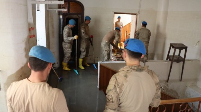 Kastamonu'nun Bozkurt ilçesinde meydana gelen sel felaketinin ardından bölgeye gelen ve yaraların sarılması için fedakarca çalışmalara katılan komandolar, bu kez de felakette zarar gören ilçe merkez camiini Cuma namazına yetiştirebilmek için kolları sıvadı.