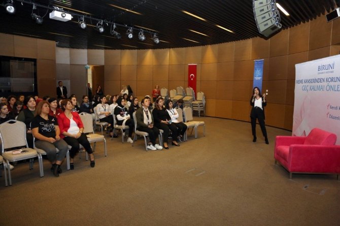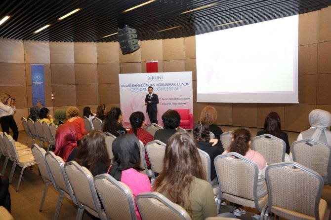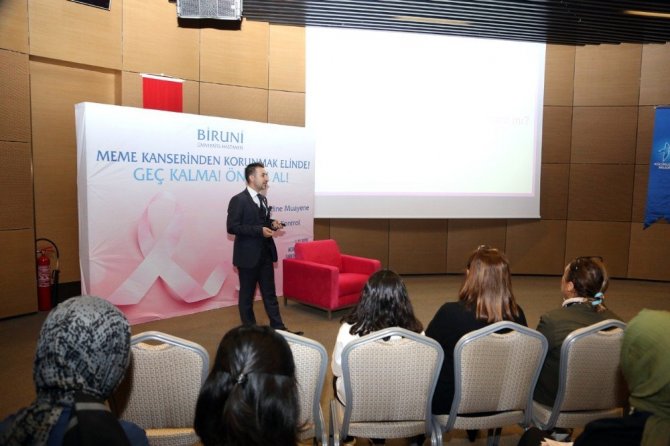 Meme Kanseri Farkındalık Ayı kapsamında Küçükçekmece Belediyesi İnsan Kaynakları ve Eğitim Müdürlüğü tarafından kadın personele yönelik ‘Meme Kanseri’ semineri düzenlendi. Genel Cerrahi Uzmanı Dr. Öğr. Üyesi Çetin Altunal, personele konuyla ilgili bilgiler vererek, önemli tavsiyelerde bulundu. Meme kanseri ile mücadelenin kadınların vücudunu ve meme kanserini çok iyi tanıması ile başladığını belirten Uzm. Dr. Çetin Altunal, “Kadın olmak, yaş, aile öyküsü, erken yaşta adet görmek, geç yaşta menopoza girmek, yağlı beslenme, alkol tüketmek gibi faktörler meme kanseri riskini artırıyor. Tüm kadınlar, 20 yaşından sonra kendi kendilerine meme muayenesi yapmalıdır. 30’lu yaşlara doğru üç yılda bir, 40 yaşından sonra ise her yıl genel cerrahi uzmanına meme muayenesi için başvurmaları gerekir. Erken tanı konduğunda meme kanserinden kurtulmak mümkündür. Evre 1’de başarı oranımız yüzde 90’lara kadar ulaşırken, evre 4’te yüzde 15’lere düşüyor” dedi.
