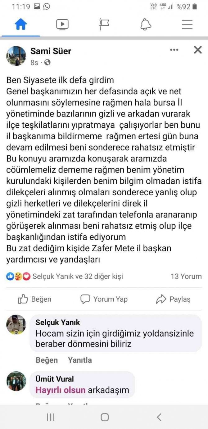Memleket Partisi Karacabey İlçe Başkanı Sami Süer sosyal medya üzerinden yaptığı açıklamada, "Ben siyasete ilk defa girdim. Genel Başkanımızın her defasında açık ve net olunmasını söylemesine rağmen hala Bursa İl Yönetiminde, bazılarının gizli ve arkadan vurarak ilçe teşkilatlarını yıpratmaya çalışıyorlar. Ben bunu İl Başkanıma bildirmeme rağmen, ertesi gün buna devam edilmesi beni son derece rahatsız etmiştir. Bu konuyu aramızda konuşarak, aramızda çözelim dememe rağmen benim yönetim kurulundaki kişilerden benim bilgim olmadan istifa dilekçeleri alınmış olmaları son derece yanlış olup, gizli hareketleri ve dilekçelerini direk il yönetimindeki zat tarafından telefonla aranıp görüşerek alınması beni rahatsız etmiş olup ilçe başkanlığından istifa ediyorum. Bu zat dediğim kişide İl Başkan Yardımcısı Zafer Mete ve yandaşlarıdır" ifadelerini kullandı.