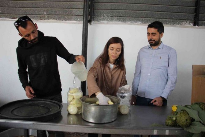 Enginarların tarladan toplandıktan sonra işletmeye getirildiğini ve burada da soyularak çanaklarının çıkartıldığını belirten Menderes, "Enginarlar tarladan toplanarak işletmemize geliyor. Burada da usta eller tarafından soyularak çanakları çıkartılıyor. Sonrasında da içleri çıkartılarak sevkiyata hazır hale getiriliyor. Talebe göre 15, 30 ve 50'lik olmak üzere bidonların içerisine koyuyoruz. Limon ve tuz bulunan özel suyu da bidonun içerisine koyuyoruz. Son olarak da hazırladığımız enginarları Türkiye'nin 81 iline kargo yolu ile gönderiyoruz" ifadelerini kullandı.