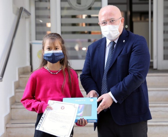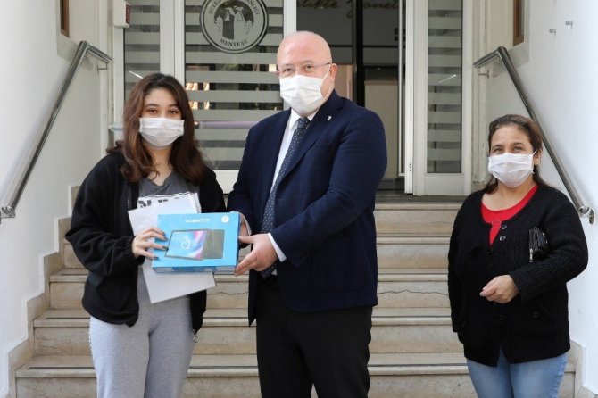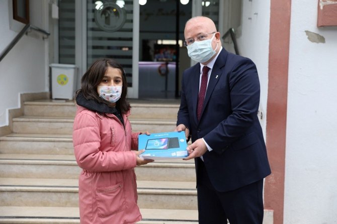 Menteşe Belediye Başkanı Bahattin Gümüş, Covid-19 pandemisi nedeniyle eğitimlerine evlerinden devam etmek zorunda kalan öğrencilere başkanlık binası önünde tabletlerini teslim etti.