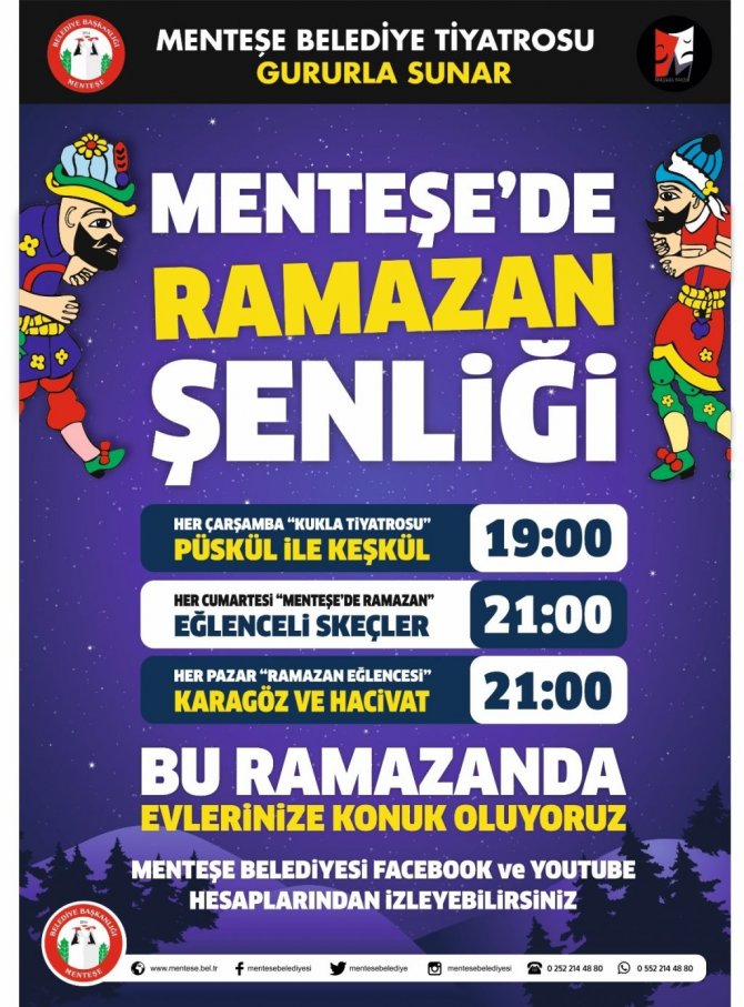 Menteşe Belediye tiyatrosu tarafından "Bu Ramazanda Evlerinize Konuk Oluyoruz" sloganıyla hazırlanan etkinliklerde, Ramazan ayı boyunca her Çarşamba çocuklar için "Püskül İle Keşkül" adlı kukla tiyatrosu, her Cumartesi "Menteşe'de Ramazan" adlı skeç programı ve her Pazar, Karagöz-Hacivat oyunu belediyenin Youtube ve Facebook hesaplarından yayınlanacak.