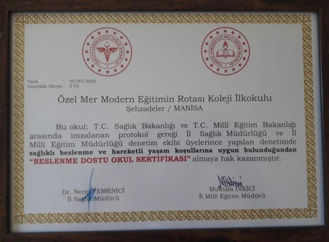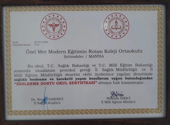 MER Kolejinin okul öncesi, ilkokul, ortaokul ve Anadolu Lisesi birimlerinin hepsi ’Beslenme Dostu Okul’ Sertifikası almaya hak kazandı. Birim müdürlerine sertifikaları MER Koleji kurucu temsilcisi ve Eğitim Koordinatörü Mehmet Kanca tarafından teslim edildi.