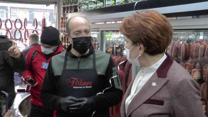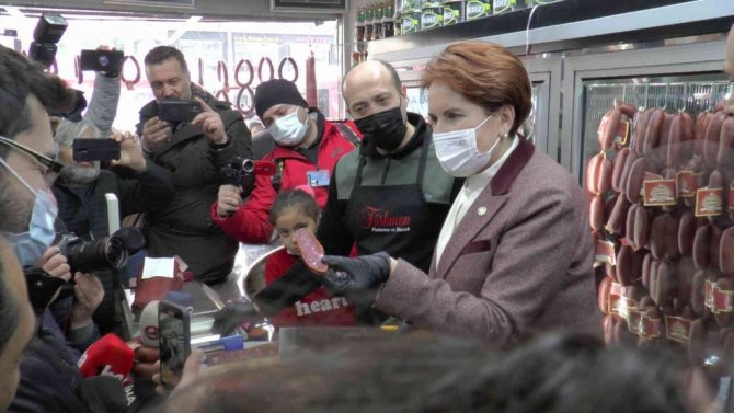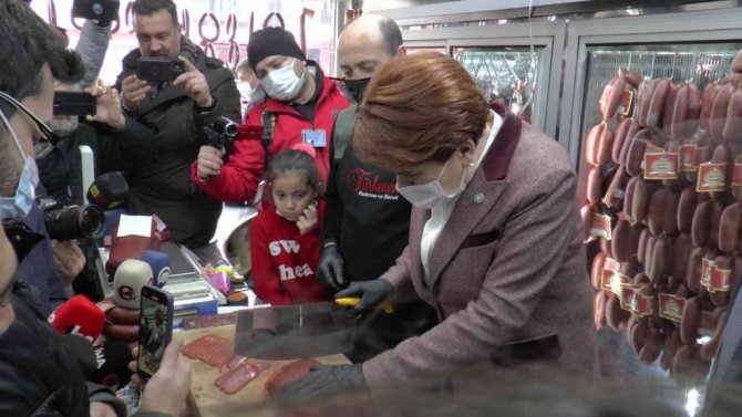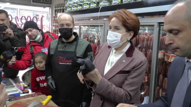 Kayseri'nin Tomarza ve Bünyan ilçelerinde gerçekleştirdiği ziyaretlerine şehir merkezinde devam eden Akşener, Sivas Caddesi üzerinde bulunan iş yerlerinde esnafla sohbet etti. Bir pastırmacıya giren Akşener, önce basın mensuplarına dilimlenmiş pastırma dağıttı daha sonra da pastırma dilimledi.