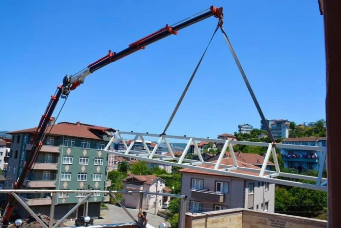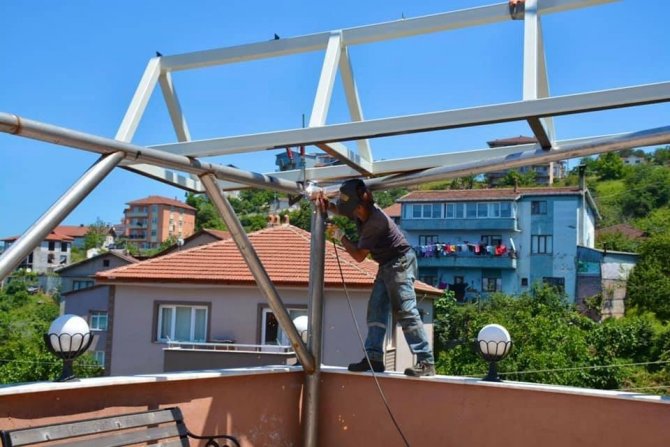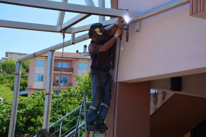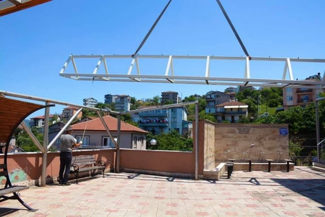 Gülüç Belediyesi Fen İşleri Müdürlüğü ekipleri tarafından Merkez Cami avlusuna sundurma yapım çalışması başlatıldı. Dışarıda namaz kılmak zorunda kalan cemaatin olumsuz hava şartlarından etkilenmemesi için demir profilden sundurma yapılıyor.