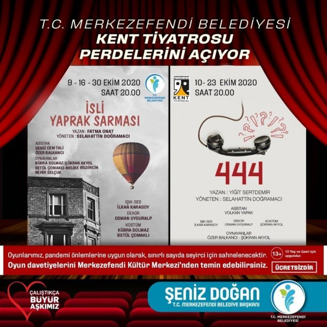 Merkezefendi Belediyesi tarafından kültürel ve sanatsal faaliyetler kapsamında Ocak ayında kurulan Merkezefendi Belediyesi Kent Tiyatrosu, tiyatro severler ile buluşmaya başlayacak. Çalışmalarına yoğun bir şekilde devam eden 75 kişilik tiyatro ekibi iki oyunla seyircinin karşısına çıkacak. 9 Ekim 2020 Cuma günü saat 20.00’de Fatma Onat’ın kaleme aldığı ‘İsli Yaprak Sarması’ ve 10 Ekim 2020 Cumartesi günü saat 20.00’de Yiğit Sertdemir’in yazdığı ‘444’ adlı oyun, Selahattin Doğramacı’nın genel sanat yönetmenliğinde seyirci ile buluşacak. Merkezefendi Kültür Merkezi Petek Salon’da oynanacak oyunlara, korona virüs tedbirleri kapsamında sınırlı sayıda seyirci alınacak.