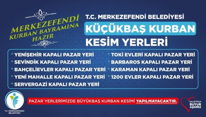Yenişehir Kapalı Pazar Yeri, Sevindik Kapalı Pazar Yeri, Bahçelievler Kapalı Pazar Yeri, Yeni Mahalle Kapalı Pazar Yeri, Servergazi Kapalı Pazar Yeri, TOKİ Evleri Kapalı Pazar Yeri, Barbaros Kapalı Pazar Yeri, Karaman Kapalı Pazar Yeri ve 1200 Evler Kapalı Pazar Yeri küçükbaş kurban kesim yerleri olarak belirlendi. Kurban kesim alanlarında kasap, zabıta ekipleri ve görevli personel hazır bulunacak. Kesim yerlerinde etlerin hijyenik şekilde muhafaza edilmesi için et poşeti, hijyeni sağlamak adına çöp poşeti hazır bulunacak. Kurban kesim yerlerinde oturma alanları olacak. Görevli personeller kesime gelen Merkezefendililere ikramlarda bulunacak. Ayrıca kesim yerlerinde büyükbaş kurban kesimi kesinlikle yapılmayacak. Kesim işlemleri tamamlandıktan sonra Çevre Koruma ve Kontrol Müdürlüğü'ne bağlı ekipler, kesim alanlarını dezenfekte edecek. Fen İşleri Müdürlüğü, Kültür Müdürlüğü, Zabıta Müdürlüğü, Park ve Bahçeler Müdürlüğü, Çevre Koruma ve Kontrol Müdürlüğü ile Çağrı Merkezi ekipleri Kurban Bayramı boyunca da görevlerinin başında olacak.