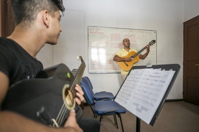 Gitar kursuna katılan 17 yaşındaki Çınar Çamlı ise ailesinden gelen müzik tutkusunu gitarla sürdürmek istediğini vurgulayarak, "Aslında ben klarnet çalıyorum. Bağlama hevesim var. Onu çalacağım. Bu yıl da gitara bakmak istedim. Gitar çalayım dedim. Sonra piyano öğreneceğim. Nevit Kodallı Güzel Sanatlar Lisesi'nde okuyorum. Orada çello çalıyorum. Burada çok iyi, muhteşem bir hocamız var, çok iyi öğretiyor. Güzel başladık, güzel de gideceğiz" ifadelerini kullandı.