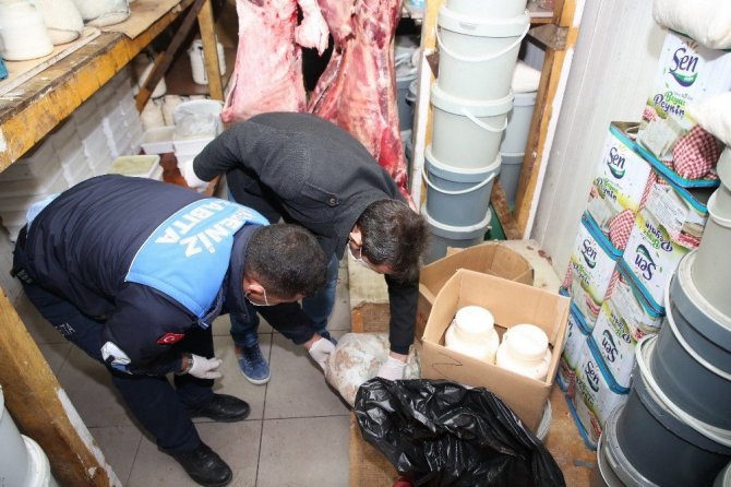 Akdeniz Zabıta Müdürü Ufuk Sivaslıoğlu, Akdeniz İlçe Tarım Müdürlüğünden uzmanlar ile İlçe Emniyet Müdürlüğü ekiplerinin de yer aldığı operasyonda, işletmenin soğuk hava deposunda yapılan kontrollerde; mühür, menşei, kesim raporu, fatura ve irsaliye bilgileri olmayan 52 kilogramlık 3 adet koyun karkası, 74 kilogram sucuk harcı, 25 kilogram iç yağı karışımı ve yaklaşık 10 kilogram koyun sakatatı ele geçirildi. Yapılan ilk kontrollerde, ele geçirilen ve menşei belli olmayan bu etlerin kokuşmaya başladığı ve insan sağlığı için tehdit oluşturması nedeniyle imhasına karar verildi.