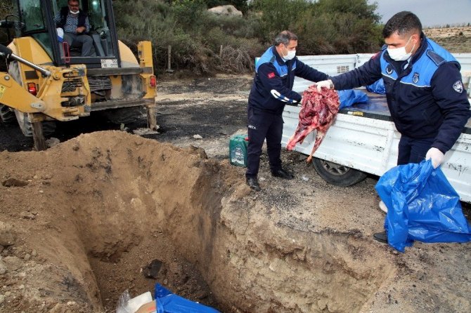 Etlerin teknik açıdan kontrolünün yapılması amacıyla uzmanlar tarafından numuneler alınırken, ele geçirilen kilolarca bozulmuş ve kokmuş et, kıyma, sucuk, peynir ve salça, zabıta aracına yüklenerek kent merkezinin dışında kırsal bir bölgeye götürüldü. İnsan yerleşiminden uzak olan bu bölgede, iş makinesi yardımıyla bir çukur açan zabıta ekipleri, kokmuş ve bozulmuş ürünleri çukura atıp benzin dökerek yaktı ve üzerini toprakla örttü.
