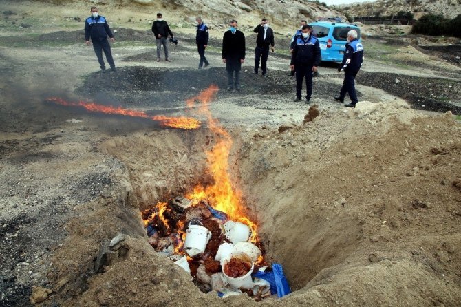 Ele geçirilen kokuşmuş gıdalar, benzinle yakılarak toprağa gömüldü