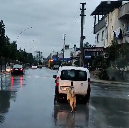 Bir aracın arkasına bağlı köpeği gören ve bir kişi cep telefonuyla çekim yaparak tepki gösterdi.
