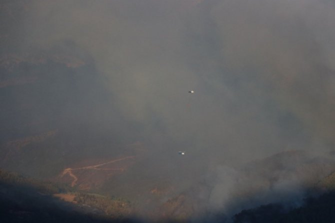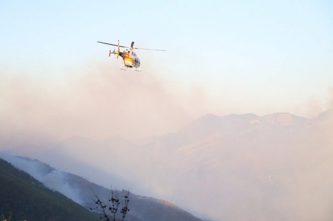 Mersin'in Aydıncık ilçesinde çıkan orman yangına, sabahın erken saatlerinde havadan da müdahale edilmeye başlandı.