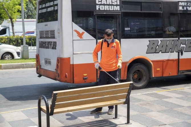 Mersin Büyükşehir Belediyesi Çevre Koruma ve Kontrol Dairesi'ne bağlı ekipler, banklardan duraklara, ATM'lerden kamu kurumu girişlerine kadar yoğun kullanılan pek çok noktayı dezenfekte ederek, bayram sonrasına hazır hale getirdi.