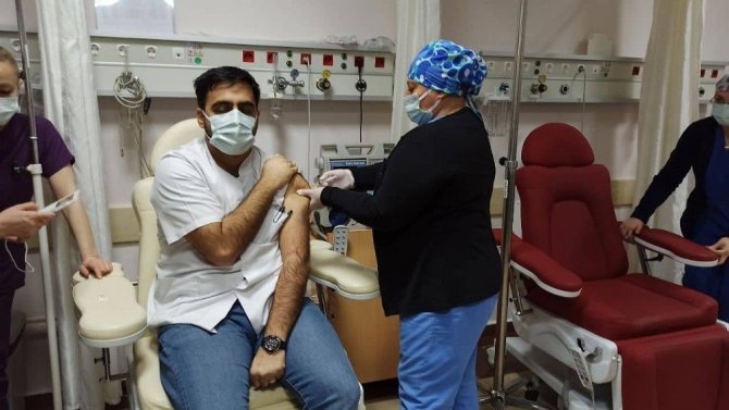 Amasya'nın Merzifon ilçesinde sağlık çalışanlarına yeni tip korona virüs (Kovid-19) aşıları, uygulanmaya başlandı.