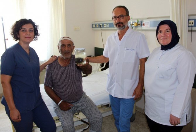 Hastanın kasık ağrısı ve idrarda zorlanma yakınmalarıyla kendilerine başvuruda bulunduğunu belirten Üroloji Uz. Op. Dr. Turab Ulaşoğlu, "Hastamız Aydın’dan geldi. Yaptığımız incelemelerde mesanede 5x6 santimetre büyüklüğünde tek parça halinde bir taş tespit ettik. Hazırlıklarımızı yaptıktan sonra taşın çok büyük olması nedeniyle açık ameliyatla taşını aldık. Şuan hastamız gayet iyi ve herhangi bir şikayeti yok. Bu taş mesanede biraz daha kalsaydı ilerde mesane kanserine sebep olabilirdi. Bu yüzden idrarında kanaması olan, şiddetli yan ağrısı veya kasık ağrısı olan, idrar yaparken zorlanma yaşayan veya ailesinde taş hikayesi olan kişilerin üroloji uzmanına başvurmalarını tavsiye ediyoruz" dedi.