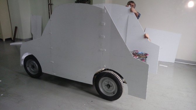 Araç üzerinde 6 adet jel akü, 3 Kw’lik elektrik motoru ve ön süspansiyon ve direksiyon sistemi tamamen okula özgü olarak tasarlandı. Dış kabuk tasarımı alanında uzman öğretmenler tarafından 3 boyutlu tasarlanarak fiberglas olarak yapıldı.