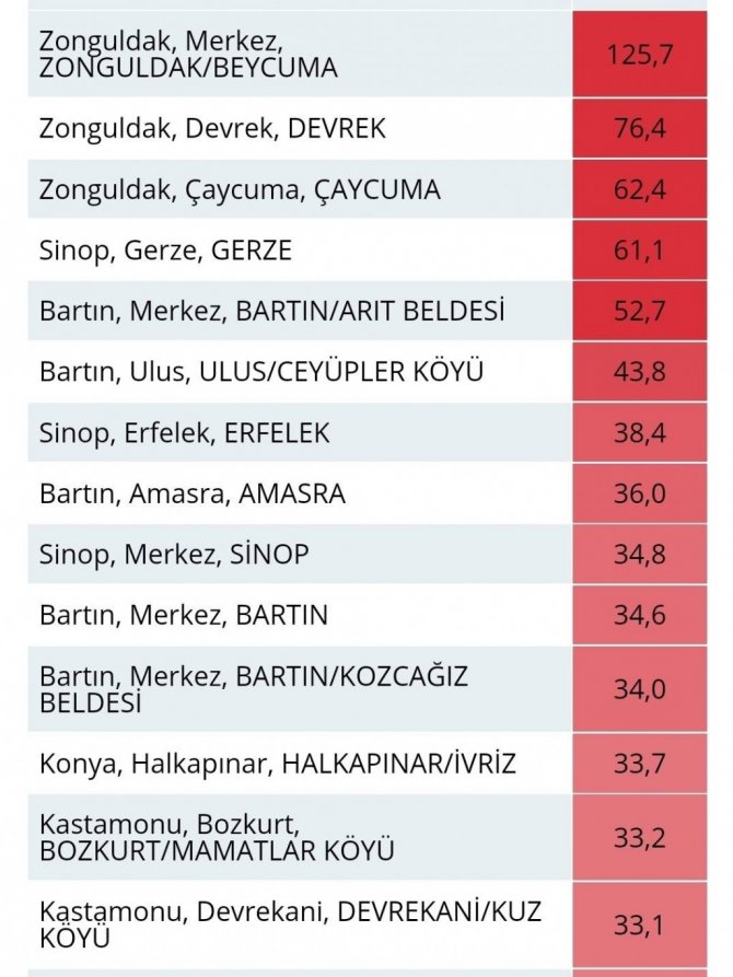 12.08.2021 - 13.08.2021 tarihleri arasında ülke genelinde en fazla yağış alan bölgeler Batı Karadeniz oldu. Meteoroloji Genel Müdürlüğü'nden yapılan açıklamaya göre, Zonguldak Merkez ve Beycuma'da metrekareye 125,7 kilogram yağış düştü. Zonguldak'ın Devrek ilçesine 76,4 kilogram yağış düşerken, Çaycuma'ya 62,4 kilogram yağış ile tabloda 3. sırada yer aldı. Tablodaki verilere göre, Bartın Merkez'e 52,7 kilogram, Ulus Ceyüpler Köyü'ne 43,8 kilogram yağış düştü. Aynı tabloda Sinop Merkez ile Kastamonu Bozkurt ve Devrekani ilçeleri de (38-33 kilogram yağış) yer alıyor.
