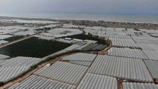Aşırı yağış ve fırtına nedeniyle "Kırmızı kod" uyarısının yapıldığı Antalya'nın Kumluca ilçesinde derelerin taşması nedeniyle su altında kalan seralar havadan görüntülendi.