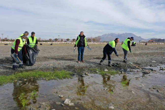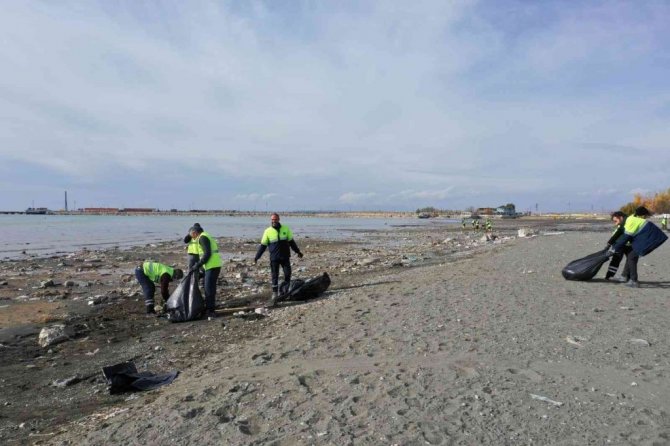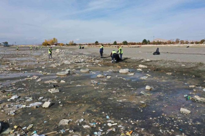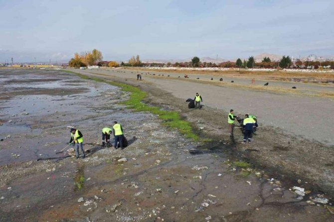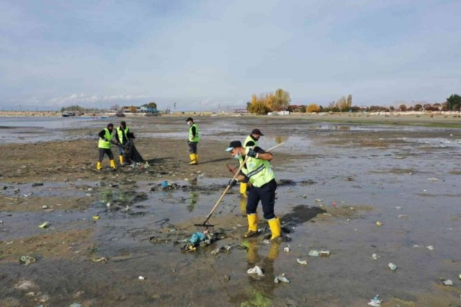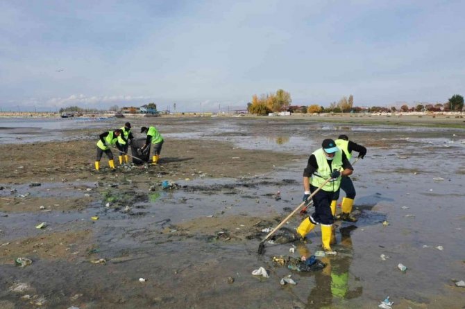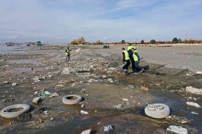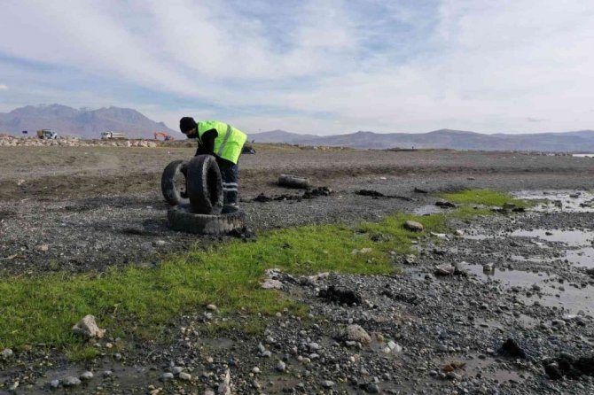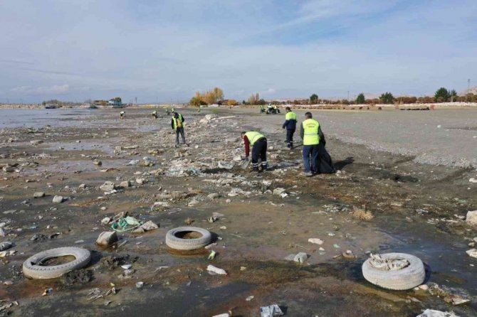 Van'ın İpekyolu Belediyesi ekipleri, yaşanan iklim değişikliği nedeniyle su seviyesi metrelerce düşen Van Gölü sahilinde 40 ton çöp topladı.
