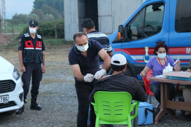 Doğu bölgelerinden Samsun'un Çarşamba ilçesine fındık ve sezonluk sebze-meyve toplamak amacıyla gelen mevsimlik tarım işçileri, Çarşamba İlçe Jandarma Komutanlığı ekiplerinin girişimleriyle, sağlık personelleri tarafından aşılandılar.