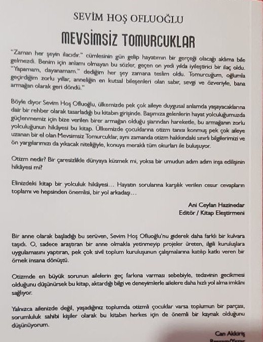 Oğlunun otistik olduğunu öğrendiğinde büyük bir şok yaşayan ancak daha sonra bu hastalıkla büyük bir mücadele veren Sevim Hoş Ofluoğlu'nun yaşadıklarını anlattığı "Mevsimsiz Tomurcuklar" adlı kitabı büyük ilgi gördü. İlk baskısı kısa sürede tükenen kitabın ikinci baskısı raflardaki yerini aldı. Otizm konusundaki yanlış algılara ve suistimallere de dikkat çeken kitap, meraklılarını bekliyor.