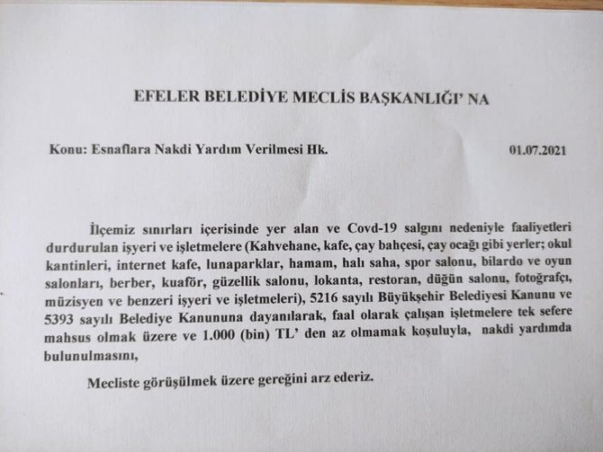 Geçtiğimiz ay Aydın Büyükşehir Belediye Meclisi'ne sunulan önergenin aynısını Efeler Belediyesi Meclisi'ne de sunan MHP'li Meclis üyeleri, pandemi sürecinde zor günler geçiren esnafların rahatlatılması adına bin TL destek verilmesini istedi. Konu ile ilgili verilen önergede "İlçemiz sınırları içerisinde yer alan ve Covid-19 salgını nedeniyle faaliyetleri durdurulan işyeri ve işletmelere, 5216 sayılı Büyükşehir Belediyesi Kanunu ve 5393 sayılı Belediye Kanununa dayanılarak, faal olarak çalışan işletmelere tek sefere mahsus olmak üzere ve bin TL'den az olmamak koşuluyla, nakdi yardımda bulunulmasını, mecliste görüşülmek üzere gereğini arz ederiz" ifadeleri yer aldı.