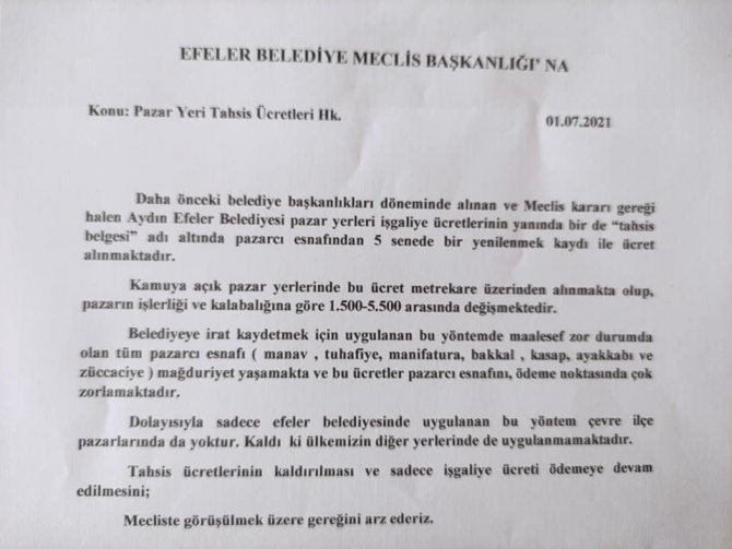 Pazarcı esnafından 5 yılda bir alınan tahsis belgesi ücretlerinin kaldırılmasına yönelik MHP'li meclis üyelerince verilen önergede "Daha önceki belediye başkanlıkları döneminde alınan ve meclis kararı gereği halen Aydın Efeler Belediyesi pazar yerleri işgaliye ücretlerinin yanında bir de tahsis belgesi adı altında pazarcı esnafından 5 senede bir yenilenmek kaydı ile ücret alınmaktadır. Kamuya açık pazar yerlerinde bu ücret metrekare üzerinden alınmakta olup, pazarın işlerliği ve kalabalığına göre 1.500 ile 5 bin 500 TL arasında değişmektedir. Belediyeye irat kaydetmek için uygulanan bu yöntemde maalesef zor durumda olan manav, tuhafiye gibi tüm pazarcı esnafı mağduriyet yaşamakta ve bu ücretler pazarcı esnafını ödeme noktasında çok zorlamaktadır. Dolayısıyla sadece Efeler Belediyesi'nde uygulanan bu yöntem çevre ilçe pazarlarında da yoktur. Kaldı ki ülkemizin diğer yerlerinde de uygulanmamaktadır. Tahsis ücretlerinin kaldırılması ve sadece işgaliye ücreti ödemeye devam edilmesini mecliste görüşülmek üzere gereğini arz ederiz" ifadeleri yer aldı.