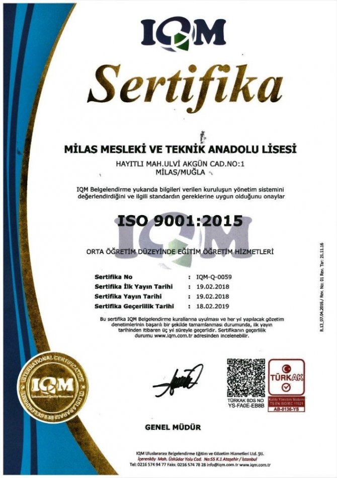 Değerlendirmeler sonucu hazırlanan rapor sonrasında sınavı başarıyla geçen Milas Mesleki ve Teknik Anadolu Lisesi, tamamen eğitim sorunlarının çözümü ve veli, öğretmen, öğrenci memnuniyeti sağlamaya yönelik, sistem belgelendirmesine dayanan ISO 9001 belgesini almaya hak kazanarak kalite yolculuğunda bir basamak daha atladı.
