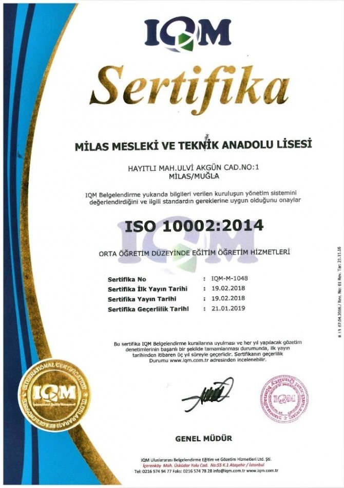 10002:2014 Öğrenci Memnuniyeti Odaklı Yönetim Sistemi tarafından akredite edilmek üzere geçtiği denetimlerden tam not alan, özellikle ISO 10002:2014 kalite yönetim belgesini hak eden Milas Mesleki ve Teknik Anadolu Lisesi, ülkemizdeki öncü okullardan biri oldu.