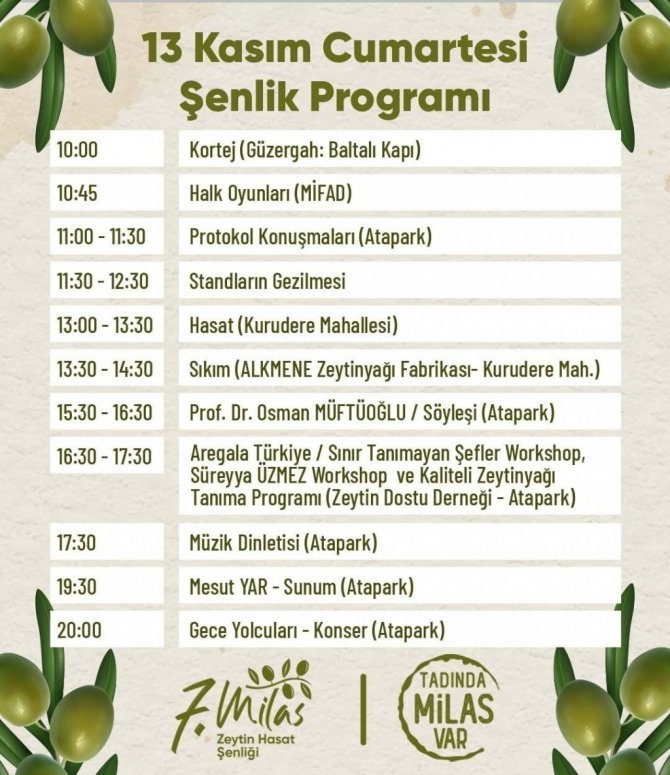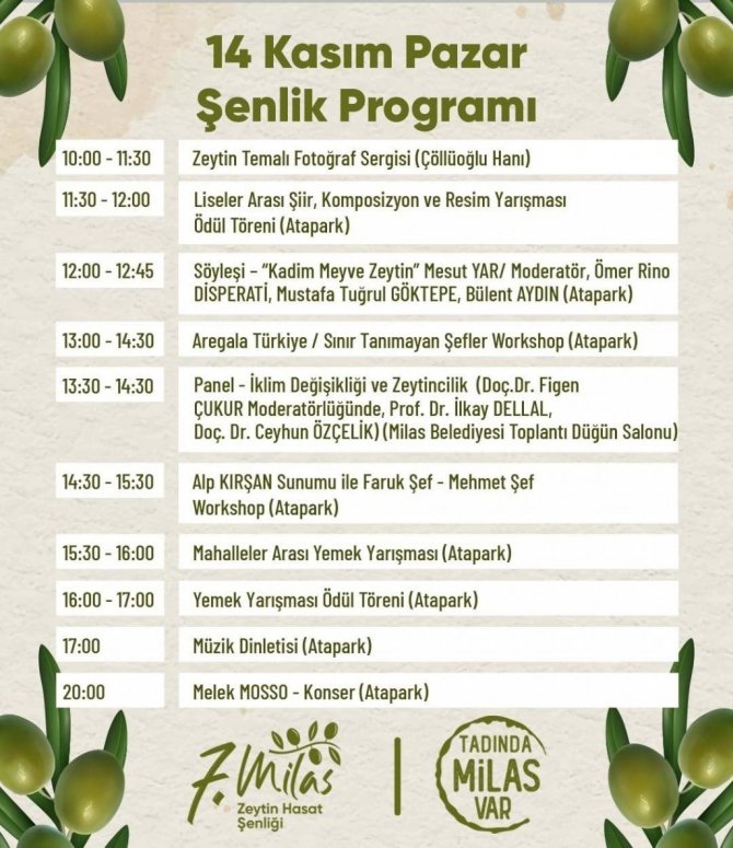 Milas'a yakışacak dolu dolu bir program ile gerçekleşecek olan Zeytin Hasat Şenliği'nin 14 Kasım Pazar günkü bölümünde ise fotoğraf sergisi, ödül töreni, söyleşiler, yemek yarışması, müzik dinletisi gibi birbirinden keyifli etkinlikler yer alacak.