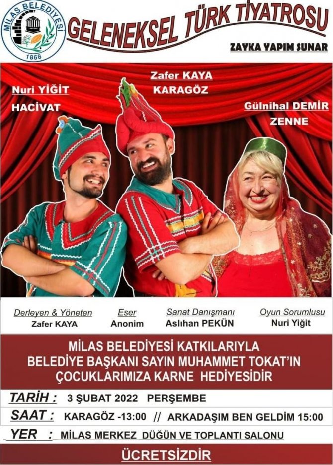 Okulların yarıyıl tatiline girmesiyle birlikte öğrencilere karne hediyesi sevinci yaşatacak olan Milas Belediyesi birbirinden keyifli 3 tiyatro oyununu izleyicilerle buluşturacak. 2-3-4 Şubat tarihlerinde Milas, Ören ve Güllük'te sahnelenecek Karagöz, Arkadaşım Ben Geldim ve Uyanık Covid ve Saf Sars adlı tiyatro oyunlarıyla öğrenciler eğlence dolu anlar yaşayacak.