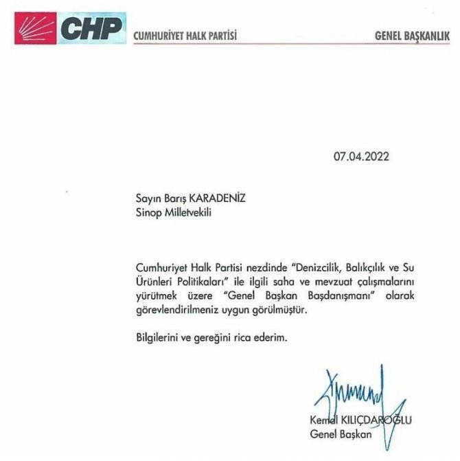 CHP Sinop Milletvekili Barış Karadeniz, Genel Başkan Kemal Kılıçdaroğlu'nun imzasıyla Genel Başkan Baş Danışmanı olarak görevlendirildi.