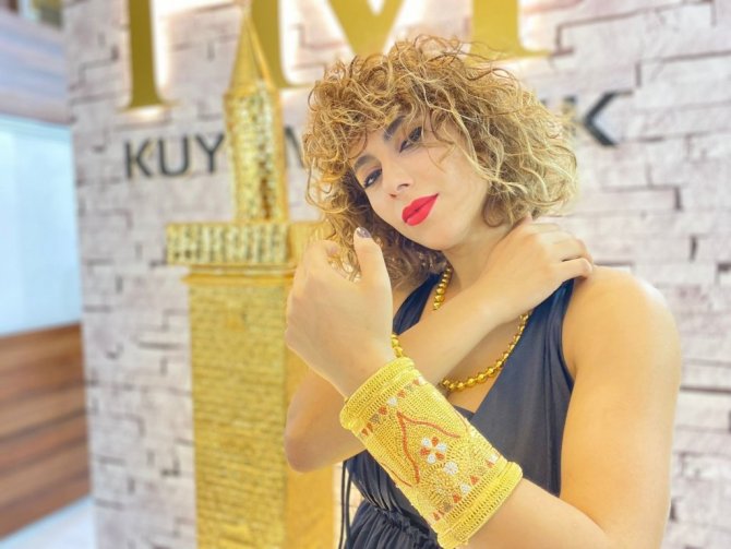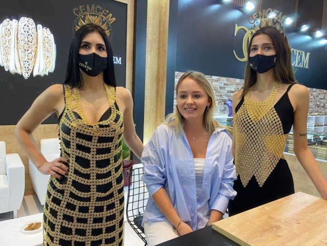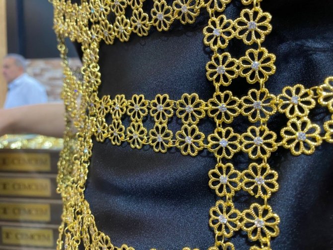 Milyonluk kıyafetlerin üreticilerinden Kıristin Cemcem ise, altın kıyafetlerinin özellikle doğu bölgelerinin geleneğine uyduğunu kaydederek, "Özellikle iki tane koleksiyon tasarlardık, yapım aşaması 14 gün sürdü. Çünkü çok işçilikli ürünler, elle tek tek mıhlanıyor, işleniyor. 7 kişilik ekiple tasarlandı bu proje. 22 ayar ve ağırlığı 2 kilograma yakın. Dönemsel fiyatı 1 milyon 300 TL meblağ geliyor. Diğer ürünümüzde aynı materyaller ve taşlarla tasarlandı, bu da 22 ayar, 1 kilogram civarında, 7 bin 900 dolar. Çok talep gördü. Özel siparişle yapıyoruz, kına ve düğünlerde pazarlıyoruz. Artık setlerin yerine altın gelinliklerin geçeceğini düşünüyoruz. Doğu bölgelerinde tercih ediliyor biraz daha ağır ve geleneksel parçalar olduğu için. İnşallah batılılar da sever. Belki 14 ayarını batı kesimleri için tasarlayabiliriz. Çiçek motifi var bunda, birçok motifini de tasarladık. Şu anda tasarımcılarımız bunların üzerine yoğunlaştılar, çeşitlendirip satışa sunmayı planlıyoruz. Umarım beğenirler" diye konuştu.