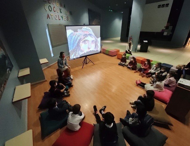 İlk kez bir müze görmenin heyecanını yaşayan çocuklar Gaziantep Zeugma Mozaik Müzesi'nde yer alan çocuk oyun alanında, görseller eşliğinde müze içerisinde geçen bir masalı dinledi.