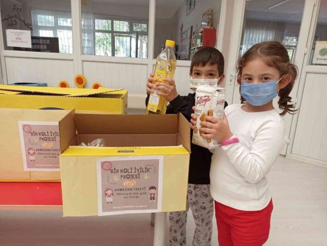 Aydın'ın Koçarlı ilçesindeki 80. Yıl Cumhuriyet Anaokulu'nda başlatılan "Bir Koli İyilik" projesi ile velilerin gönderdiği gıda malzemeleri anaokulu öğrencilerinin desteği ile hazırlanarak ihtiyaç sahibi ailelere ulaştırıldı.