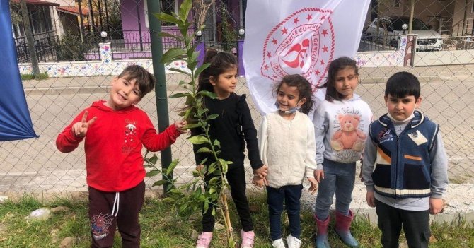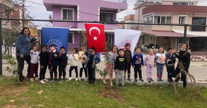 Aydın'ın Kuşadası ilçesinde bir araya gelen minik sporcular, Güzelçamlı Sentetik Futbol Sahası bahçesinde fidanları toprakla buluşturdu.
