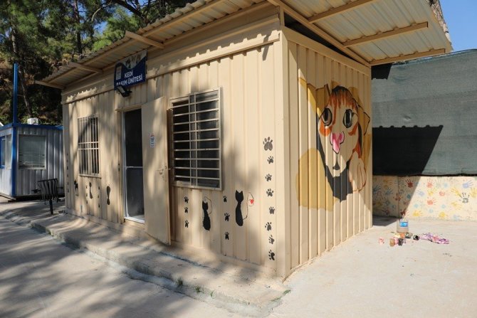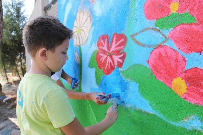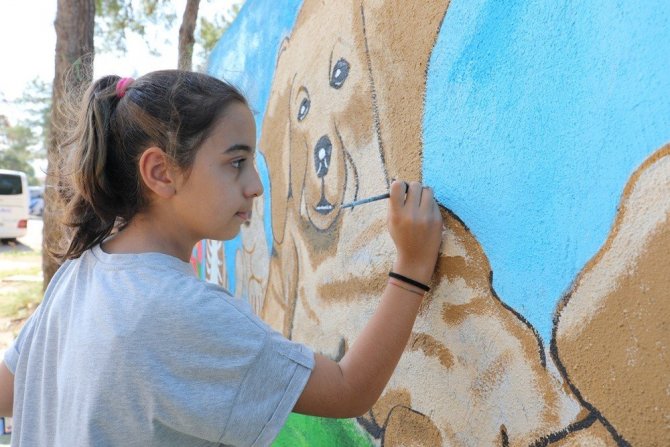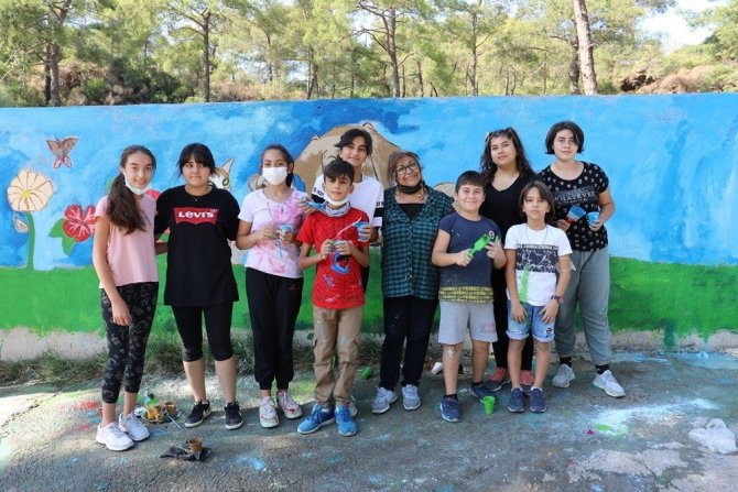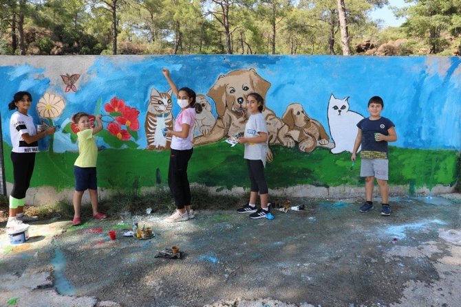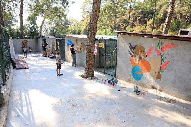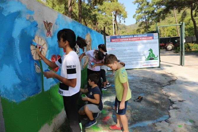 Minik ressamlar, Marmaris Belediyesi Geçici Hayvan Bakımevi'nin duvarlarını kedi, köpek, çiçek gibi figürler çizerek rengarenk boyadı.