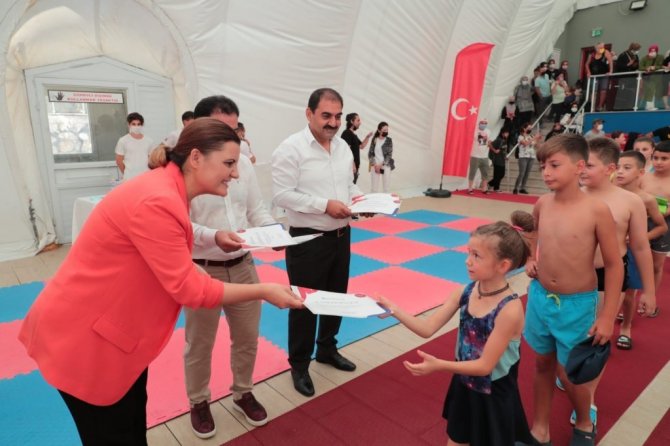 Tepeköy Mahallesi'ndeki İzmit Belediyesi Kapalı Yüzme Havuzu'nda düzenlenen sertifika törenine İzmit Belediye Başkanı Fatma Kaplan Hürriyet'in yanı sıra Başkan Yardımcısı Nurettin Bulut ve Spor İşleri Müdürü Mithat Ağa katılırken aileler de çocuklarını bu gururlu günlerinde yalnız bırakmadı. Başkan Hürriyet, yüzme kursunu tamamlayan yüzücülere sertifikalarını tek tek takdim etti.