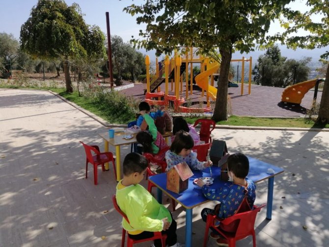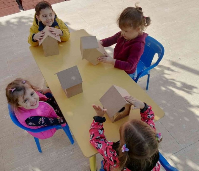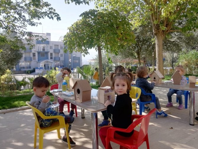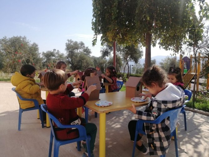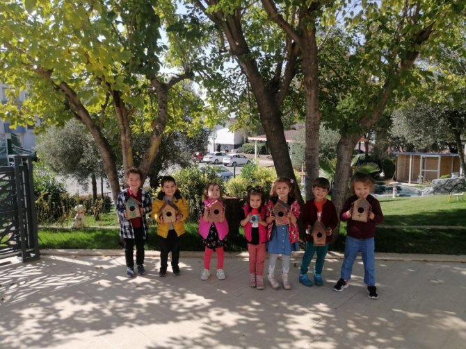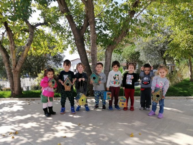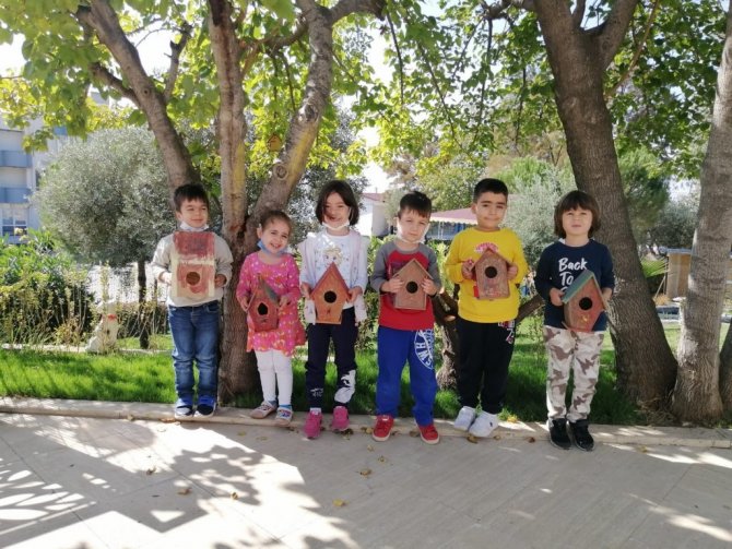 Aydın Adnan Menderes Üniversitesi (ADÜ) Anaokulu öğrencileri sosyal sorumluluk projesi kapsamında oluşturdukları ahşap kuş evlerini boyayarak anaokulu çevresindeki ağaçlara astılar.