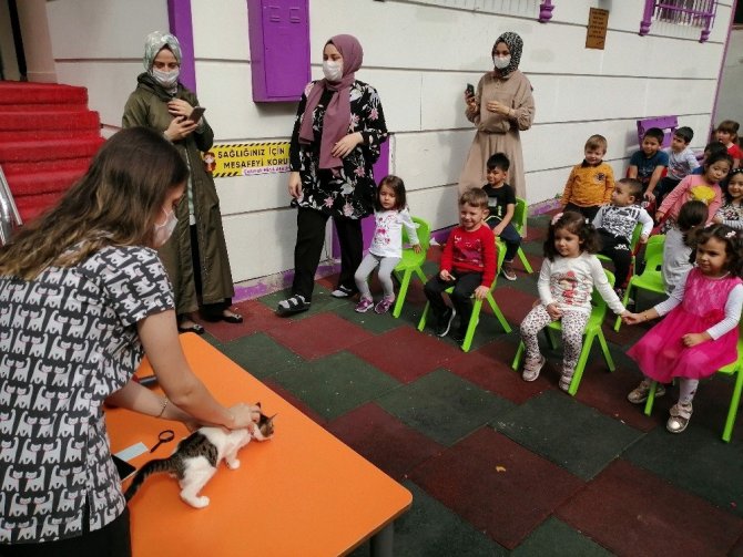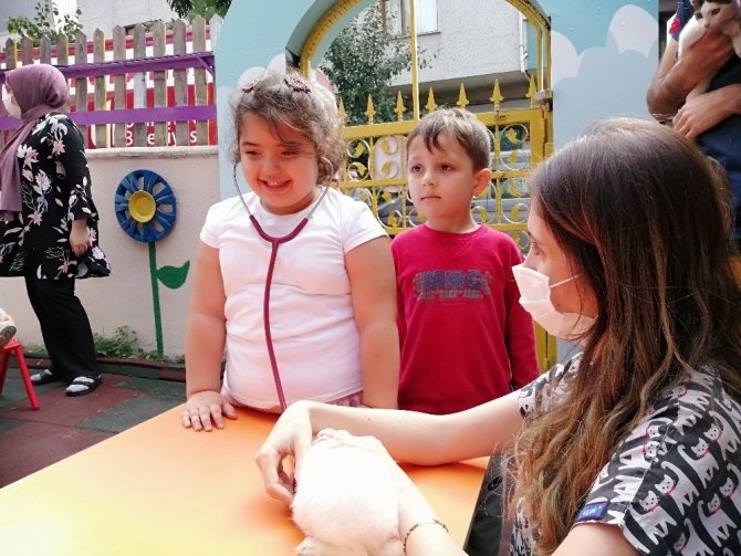 Bu ay 4 Ekim Dünya Hayvanları Koruma Günü nedeniyle böyle bir uygulama yaptıklarını belirten anaokulu öğretmeni Gülsemin Çolak; “Bizde her ay bir meslek belirleyip çocuklara o mesleklerin tanıtımını yapıyoruz. Bu ay da hayvanları koruma günü olduğu için okulumuza bir tavşan almıştık. Hem tavşan bakımını öğrenmek için hem de veteriner hekimi tanıtmak için çocuklara böyle bir etkinlikte bulunduk” dedi.