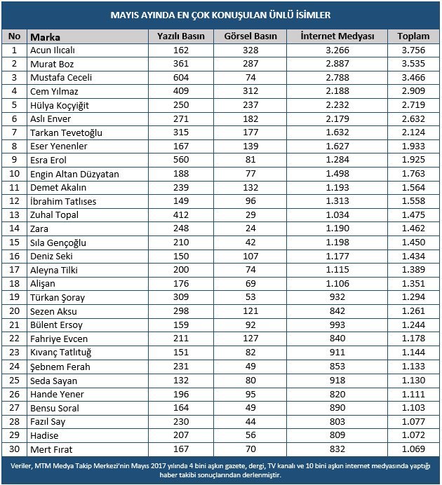 Listede yer alan ünlüler arasında Aslı Enver 2 bin 632, Eser Yenenler bin 933, Esra Erol bin 925, Engin Altan Düzyatan bin 763, Demet Akalın bin 564 ve İbrahim Tatlıses bin 558 adet habere konu oldular.