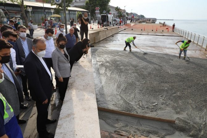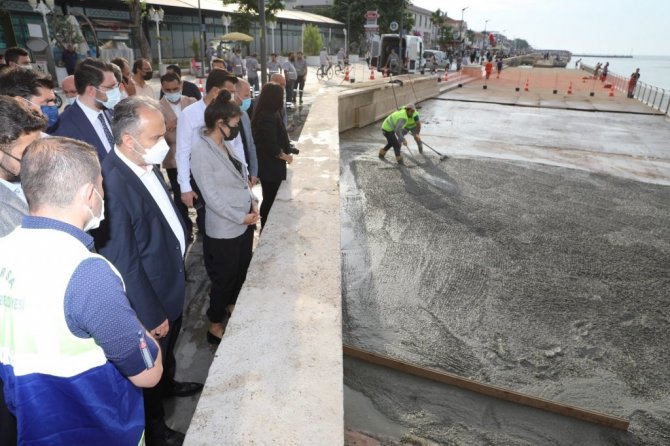 Bursa Büyükşehir Belediye Başkanı Alinur Aktaş, Mudanya ilçesinde yapılan çalışmaları yerinde inceleyerek eksik ve aksaklıkları Mudanyalı esnaf ve vatandaşlarla görüşerek çözüm ürettiklerini söyledi. 2015-2017 yılları arasında yapımı tamamlanan ancak müteahhit kaynaklı sorunlar yaşanan, birkaç kez ihalesi durdurulan sahil düzenleme çalışmalarında yeni aşamaya geçtiklerini belirten Başkan Aktaş, "İskele üzerindeki ahşap kompozit kaplama deniz suyundan hasar görmüş, zamanla deforme olmaya başlamıştı. Birkaç kez tamir ve tadilatı yapıldı. Ama vatandaşlardan bunların değiştirilmesi yönünde istek vardı. Teknik ekiplerimiz tarafından önce 50 metrekare büyüklüğünde bir alanda baskı beton için örnek çalışma yapıldı. Baskı betonunun uygulanabilir, sağlıklı ve deniz suyundan etkilenmediği görüldü. Yaklaşık 4800 metrekarelik alanda ahşap kaplama kısım kısım sökülerek yerine baskı beton uygulanacak. Bittiğinde vatandaşlarımızın rahatlıkla gezebileceği, görsel anlamda güzel bir yapı ortaya çıkacak. Özellikle deniz suyundan etkilenerek yürüyüş yollarında hasar oluşan ve bize de sıkıntı yaşatan konu bertaraf edilecek. Hayırlı olsun" dedi.