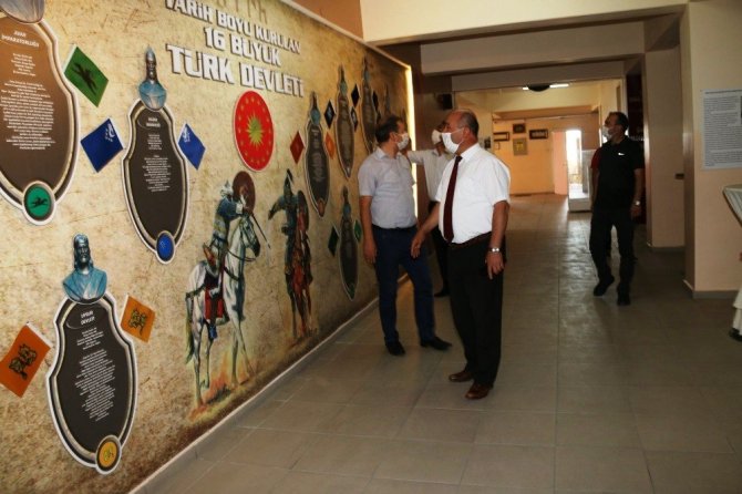 Okul Müdürü ve idareciler tarafından karşılanan İl Milli Eğitim Müdürü Hasan Başyiğit’e 2020-2021 Eğitim Öğretim Yılı hazırlıkları kapsamında yapılan çalışmalar ve salgın hastalıkla ilgili alınan tedbirler konusunda bilgilendirmede bulunuldu.