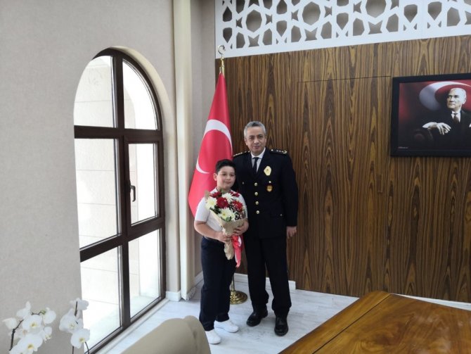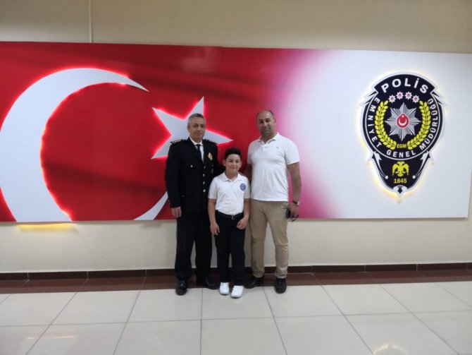 23 Nisan Ulusal Egemenlik ve Çocuk Bayramı kutlama programı çerçevesinde Mahmut Esat Bozkurt ilköğretim Okulu 2. Sınıf öğrencisi Ahmet Mert Duman ve öğretmenleri Kuşadası İlçe Emniyet Müdürü Mehmet Ali Berksoy'u makamında ziyaret etti.
