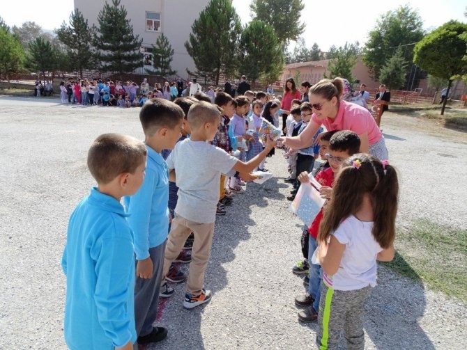 Program 2. Sınıf öğrencileri tarafından 1. Sınıf öğrencilerine içerisinde kırtasiye malzemeleri bulunan “Hoş geldiniz” paketlerinin verilmesiyle sona erdi. (MA-EFE)