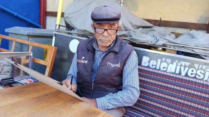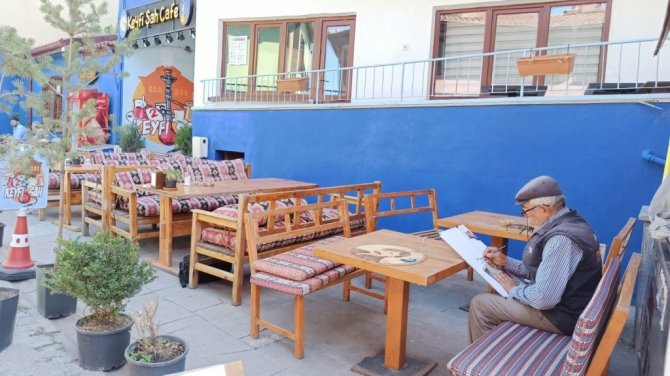 Eskişehir'de yaşayan 68 yaşındaki Ali Ünal, ilkokulda tebeşirle tahtaya resim çizerek başladığı sanatını 50 yıldır sürdürüyor ve eserlerini kafede...