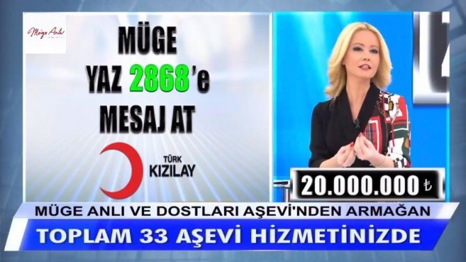 İzleyicileriyle el ele veren Araştırmacı-Gazeteci Müge Anlı, Kızılay için 20 Milyon lira bağış toplayarak aşevi filosu kurdu. Filodaki aşevleri canlı yayında hesaplandı.